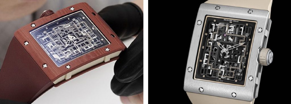 Il movimento automatico è inserito in una cassa rettangolare (mm 36×45,6 spessore mm 9,5 w.r. a m.30) in titanio grado 5 o in Quartz Tpt terracotta, quest’ultima completata da un cinturino in caucciù in colore coordinato. Il movimento CRMA9, scheletrato è in titanio grado 5 trattato con finitura grigia e nera; lo spessore è di 4,12 mm, i rubini sono 25, le A/h 28.800, il bilanciere (CuBe a 4 braccia) è a inerzia variabile, il rotore unidirezionale è in platino e il bariletto garantisce una carica di 50 ore. Il quadrante scheletrato lascia vedere l’accurato lavoro compiuto sui molteplici componenti perfettamente levigati. Gli indici risaltano sulla lunetta creando un filo conduttore legato alla leggenda del filo di Arianna che qui si dipana all’interno del ruotismo; tradizionali invece le lancette luminescenti.