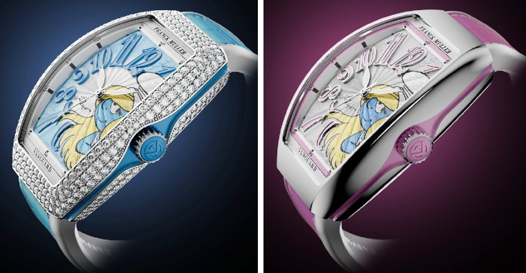 Oggi Franck Muller li ripropone sul quadrante protetto da vetro di zaffiro e lavorato a guillochage che viene sottoposto a più di venti strati di lacca, casse in acciaio inossidabile anche incastonate con diamanti e disponibili con cinturini integrati rosa o azzurro.
