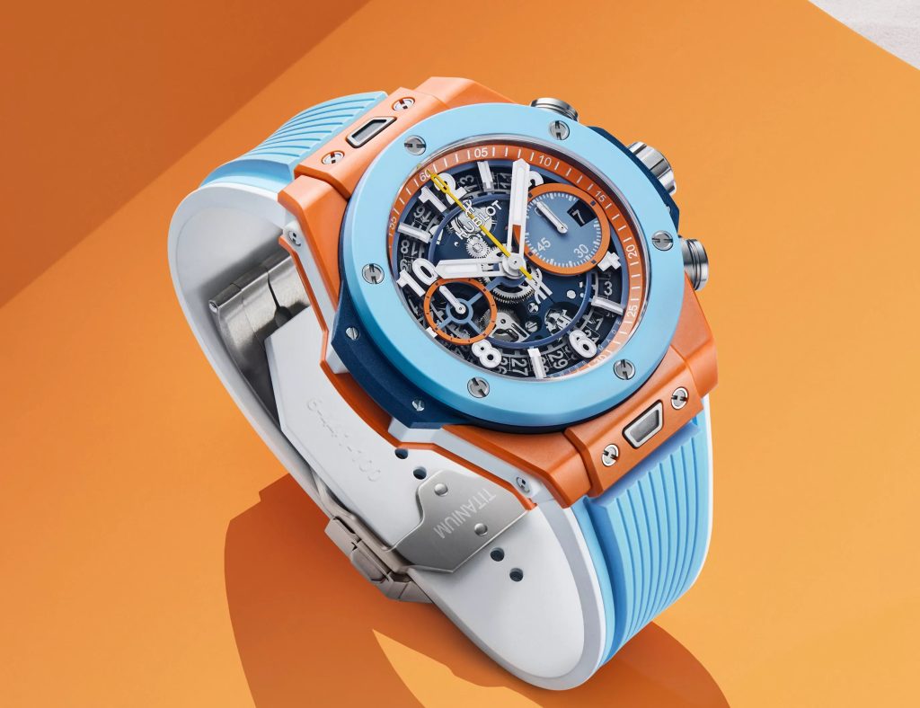 Dall’altra parte del Mediterraneo, nell’isola di Micene, Hublot ha presentato il 5 Giugno il nuovo Big Bang Unico Summer 2025, in ceramica High-tech arancione, cassa ø 42 mm w.r. a m.100, con lunetta celeste e quadrante opaco nei due colori. Cinturino colorato in caucciù. Movimento HUB1280 cronografico di manifattura Unico a carica automatica flyback con ruota a colonne, platina e ponti: placcati blu, datario alle ore 3:00, massa oscillante in tungsteno satinato circolare placcato blu.