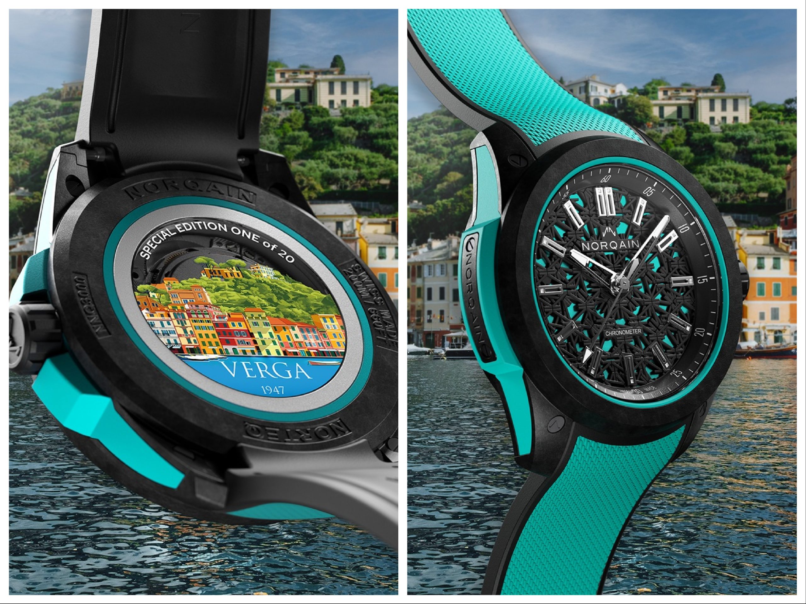 Fino all’8 Giugno a Portofino nella boutique Norqain si può vedere (e naturalmente acquistare) la Special Edition di 20 esemplari dedicati a Verga 1947, il negozio di Calata Marconi, che sul retro ha dipinto le case che si affacciano sul mare della celebre località. Cassa, 42 mm w.r. a m.200, in titanio sabbiato, colori solari, sul fondello la scritta One of 20; movimento automatico svizzero Calibro NN20/1 realizzato in esclusiva da Kenissi. Cinturino in caucciù.