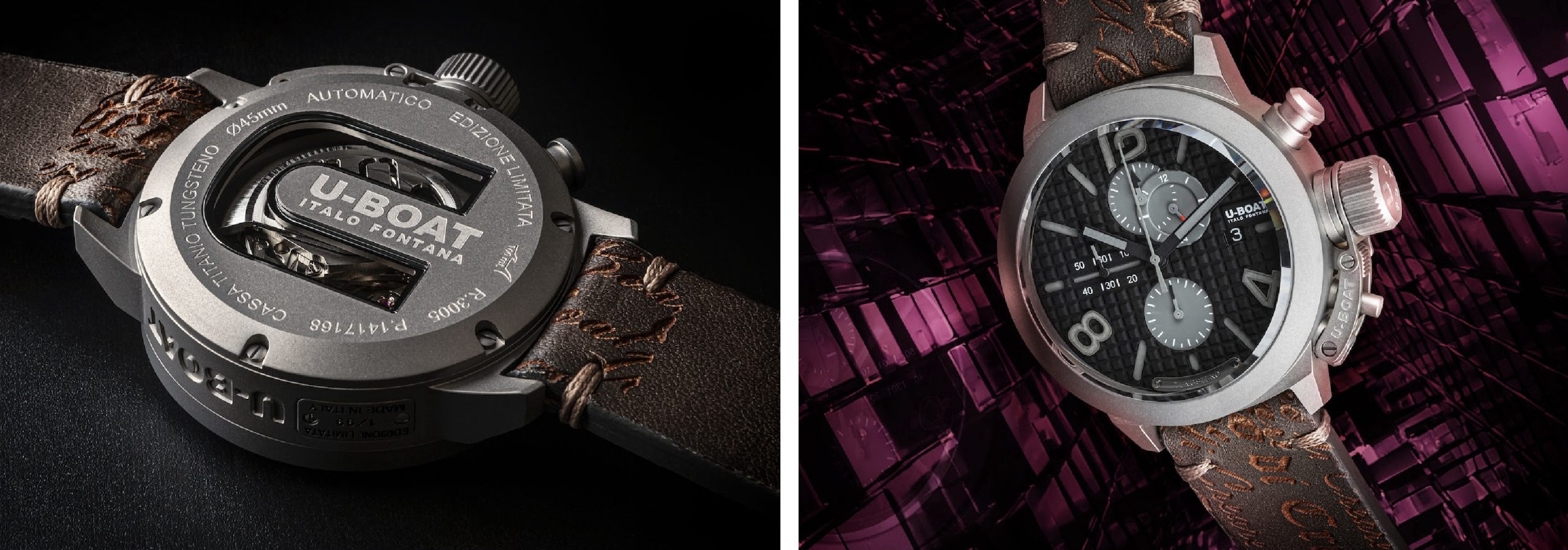 Nella cassa in titanio (la lunetta è in tungsteno opaco) ø 45 mm w.r. a m.100 e con finitura opaca, il movimento è il Calibro automatico svizzero Sellita SW500 con rotore tagliato a laser a forma di “U” visibile dal fondello realizzato in vetro zaffiro; alle 3 la corona e alle 3.30 un pulsante brevettato per facilitarne l’estrazione, mentre i pulsanti del cronografo per attivazione e reset sono posizionati rispettivamente a ore 2 e 4.