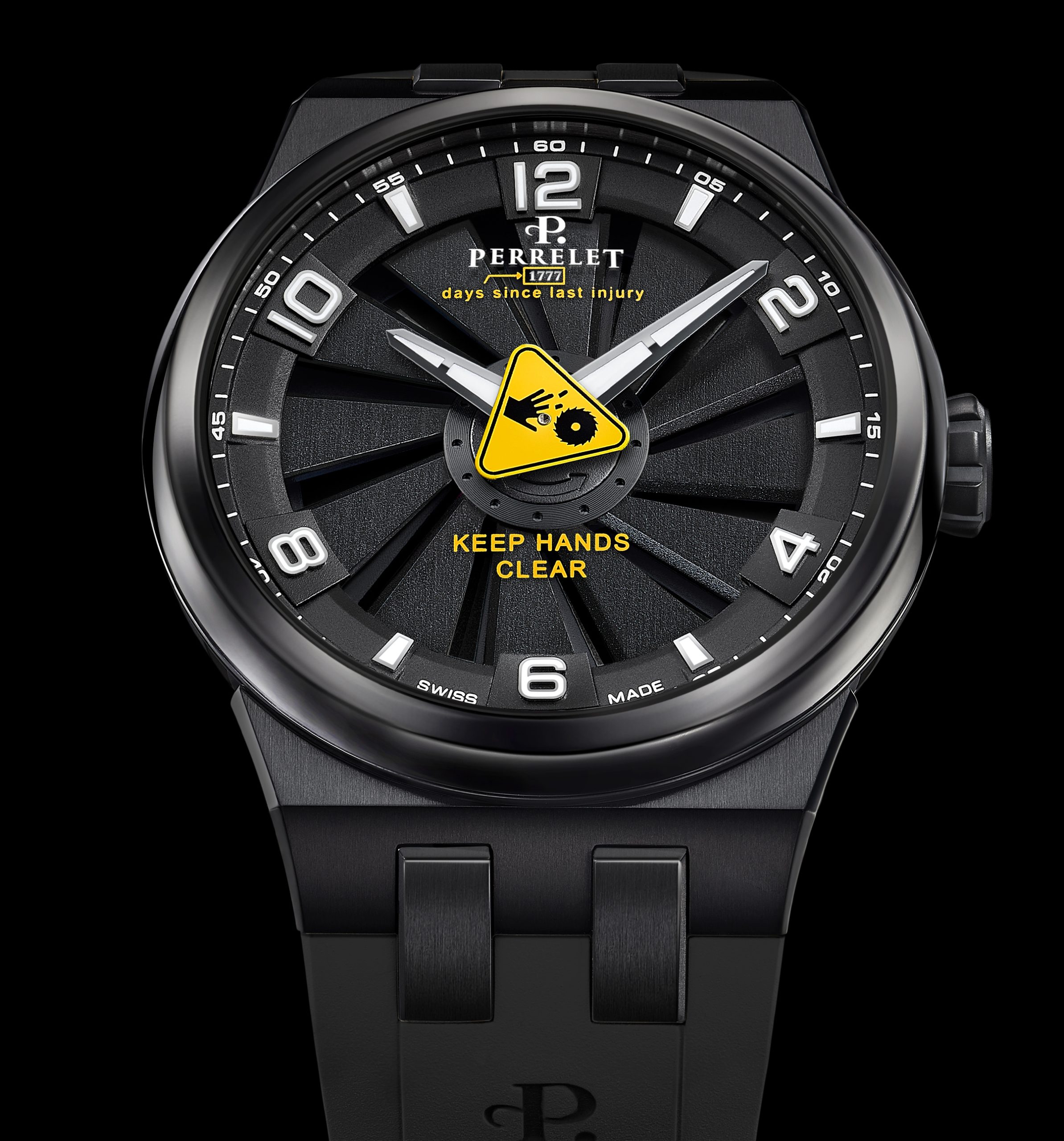Perrelet nello scorso Dicembre, ha donato all’asta Charity Time for Art, a favore di Swiss Institute, un orologio “unique piece” con il quadrante ideato da un artista e visto il successo ottenuto prosegue su questa strada instaurando una collaborazione con Romanic André. L’artista francese che nel 2017 ha chiamato il suo atelier Seconde/Seconde/. L’ironia di Seconde/Seconde/ non ha scelto ciò che si vede attraverso le pale rotanti, ma altri componenti essenziali dell’orologio. Sulla lancetta centrale dei secondi è posizionato l’avviso “Keep Hands Clear”, segnale stradale che avverte gli automobilisti della presenza di macchinari in movimento o di altri pericolosi intralci; poi l’attenzione dell’artista si è spostata sulla data di fondazione del Marchio (1777 )aggiungendo in inglese “…days since last injury”, parafrasando il cartello “Safety First” che nelle fabbriche anglosassoni indica il numero di giorni senza infortuni a dimostrazione della sicurezza sul lavoro.