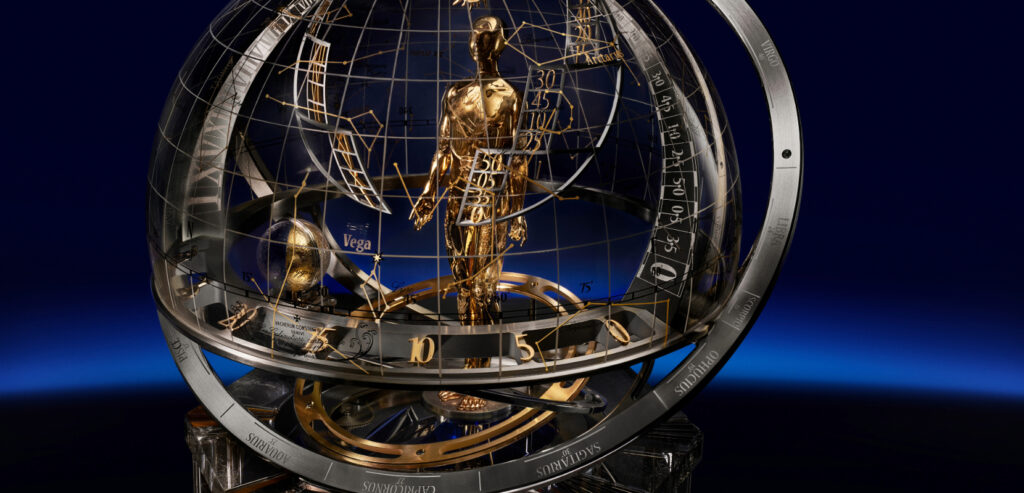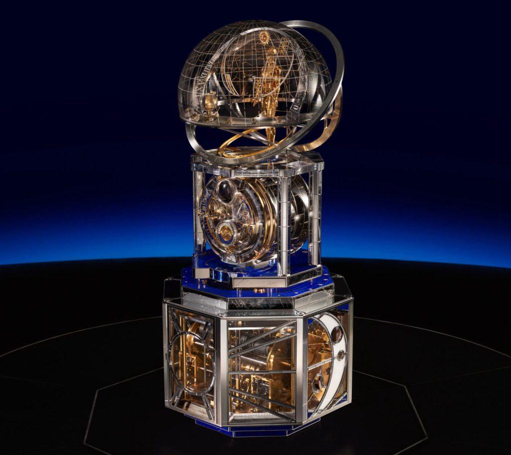 Per festeggiare il 270* anniversario della Marca, al Louvre VC ha realizzato “La ricerca del Tempo”, capolavori orologieri nel corso degli anni che mostrano 23 complicazioni tra le quali tourbillon, calendario perpetuo, tempo dell’alba e del tramonto, indicazioni zodiacali, indicazione della luna aderente alla realtà durante 110 anni. Nel Desk Clock i componenti sono oltre 6000 e la realizzazione dei 20 esemplari ha comportato sette anni di lavoro nelle varie divisioni della Manifattura. Un oggetto che non si mai visto prima. Tanto per stupirvi con un dettaglio, la figura dell’automa (un Astronomo) compie 144 gesti diversi, compreso quello di indicare il tempo su un quadrante celestiale, mentre la musica fa ascoltare una composizione di Woodkid. Il movimento del Desk Clock, a carica manuale è il Calibro 3670, che riunisce 512 componenti miniaturizzati ed è protetto da quattro brevetti.