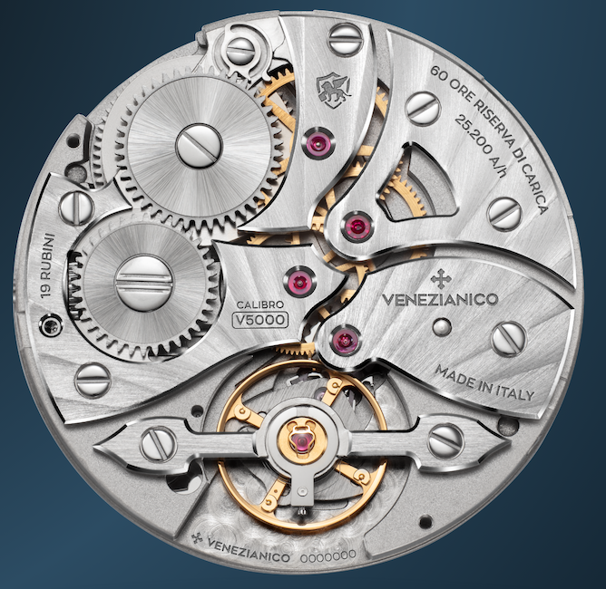 I fratelli Morelli, proprietari dell’impresa veneta, pensavano da tempo a un movimento italiano e l’incontro con Fausto Berizzi, responsabile tecnico di OISA, con un passato in Frédéric Piguet, Lemania e Vaucher Manufacture, è stato fondamentale.Berizzi è entrato subito in sintonia con Andrea Menegazzo, responsabile della progettazione e sviluppo del prodotto Venezianico e il risultato è il Calibro V5000, disegnato su misura, registrato e costruito in Italia, un movimento a carica manuale con prestazioni tecniche di alto livello (25.200 A/h, riserva di carica di oltre 60 ore e precisione cronometrica di ±3 secondi al giorno, il treno dei secondi è separato da quello delle ore e dei minuti per ridurrebbe interferenze e la stessa attenzione è stata data alla scelta di altri componenti). La struttura a quattro ponti consente uno spessore contenuto e il ponte del bilanciere a doppio ancoraggio è stato progettato per garantire maggiore stabilità e regolarità di funzionamento. Il bilanciere in Atokalpa (lega di rame e berillio)è regolato da 4 masselottes che consentono di variare l’inerzia senza alterare la lunghezza attiva della spirale, il perno del bilanciere è protetto dal sistema KIF Elastor, una molla elicoidale a forma di stella, che circonda la pietra d’incasso e consente micro-spostamenti controllati. In caso di impatto, la molla si deforma leggermente assorbendo l’energia e riportando il bilanciere in posizione ottimale.