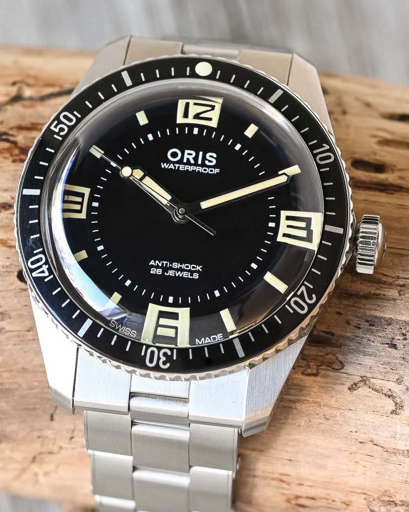 Sul fondello si leggono le incisioni che celebrano il 60° anniversario del design. Sul quadrante nero opaco sono stati ripresi dettagli del passato: la scritta anti-shock a ore 6 è in carattere vintage, indici più corti, grandi numeri luminescenti alle ore 3, 6, 9 e 12 riportano direttamente al modello originale del 1965, così come il logo Oris in carattere vintage che viene impiegato per la prima volta dopo tanti anni. Il Divers Sixty-Five con bracciale in acciaio inossidabile come già indicato, è completato da un cinturino aggiuntivo in pelle.