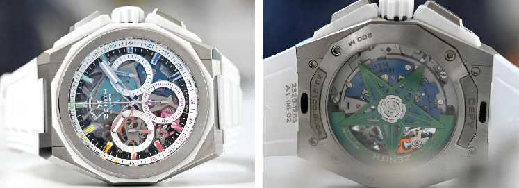 Questa edizione DEFY Extreme Chroma ha la cassa ø 45 mm w.r. a m.200, in titanio lucido e spazzolato e la lunetta in ceramica bianca; sul quadrante protetto da cristallo di zaffiro dettagli multicolore indicano le funzioni: lancette centrali per ore e minuti, lettura cronografica a 1/100 di secondo (la lancetta del cronografo al centro compie una rivoluzione al secondo); il contatore dei 30 minuti è a ore 3 quello delle 12 ore a ore 9, quello dei 60 secondi a ore 6. Il cristallo di zaffiro protegge anche il retro della cassa e mostra la massa oscillante azzurra. Il Movimento automatico è il Calibro El primero ad alta frequenza che consente la lettura cronografica a 1/100 di secondo; 36.000 A/h, riserva carica 50 h. Il sistema di cinturini completamente intercambiabili consente di passare facilmente dal cinturino in caucciù bianco al bracciale in titanio.
