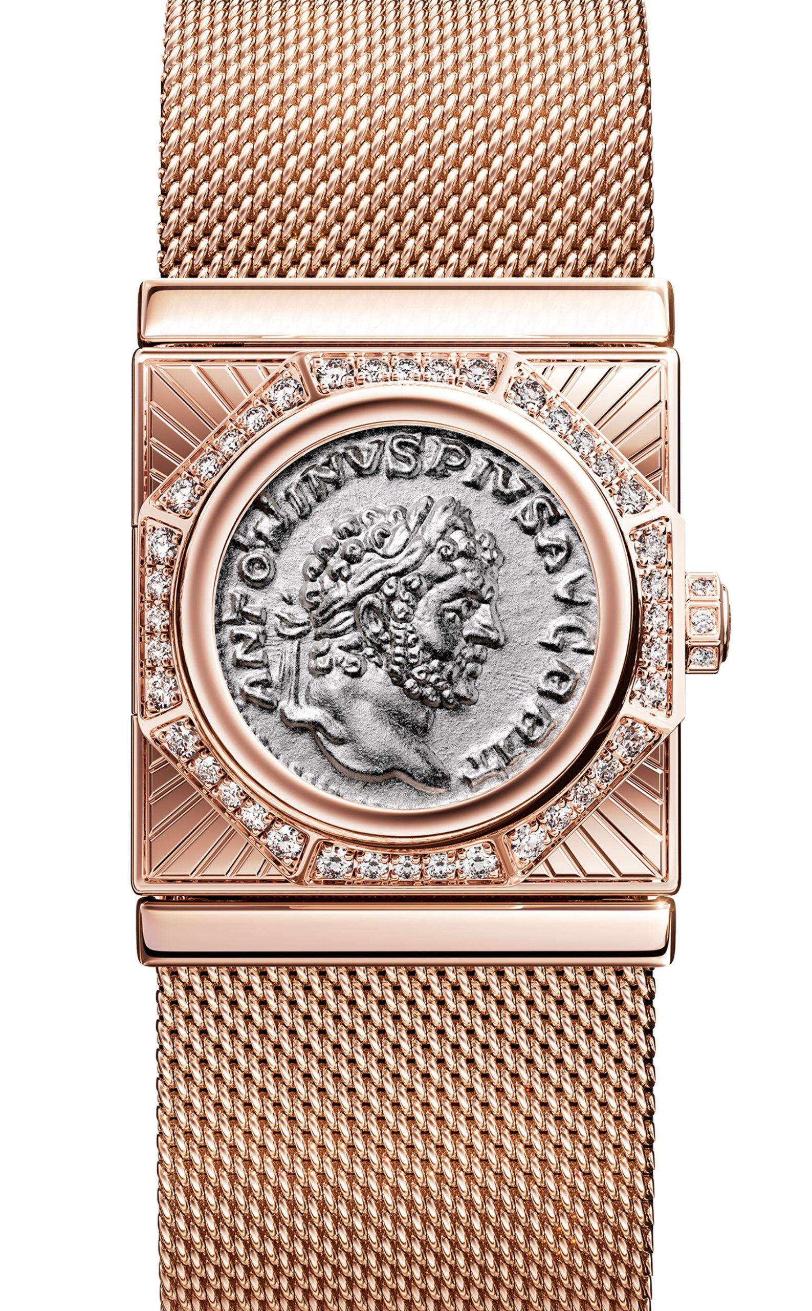 Nell’orologio Moneta un’antica moneta autentica in argento datata 198–297 d.C. e raffigurante l’Imperatore Caracalla è incastonata nel coperchio, aprendolo si ammira il quadrante in madreperla bianca con 12 indici in diamanti e con lancette placcate oro rosa protetto da cristallo di zaffiro che protegge anche il fondello per far ammirare il movimento. Progettato e prodotto interamente da Bvlgari a Le Sentier, nel Giura svizzero, il movimento Piccolissimo introdotto nel 2022, è il Calibro BVL100 (era ed è il calibro rotondo più piccolo al mondo, con un diametro di 13.50 mm, uno spessore di 2.50 mm e un peso di 1.9 gr). Nel Calibro BVP100 le A/h sono 21.600 e la riserva di carica è di 30 ore. Il diametro della cassa impreziosita da brillanti, è di 33 mm ed è in oro rosa con diamanti anche la corona. Infine è in oro rosa il bracciale in maglia milanese (con fibbia in oro rosa ad ardiglione) che Bvlgari impiega per la prima volta e che è disponibile in queste misure: 135–145–155 mm / 160–170–180 mm. L’ispirazione arriva da un analogo gioiello realizzato da Bvlgari negli anni Sessanta.