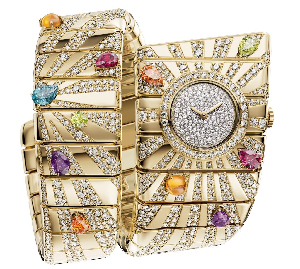 Il Tubogas manchette, ispirato a un gioiello realizzato da Bvlgari negli anni Settanta, è in oro giallo e ha la cassa diametro 16 mm, impreziosita con diamanti, nella quale è inserito il movimento di Manifattura a carica automatica Lady Solotempo Calibro BVS100 (spessore di 3.90 mm, peso 5 gr) che presenta la massa oscillante decorata con il logo Bvlgari e un motivo soleil. La riserva di carica è di 50 ore. Protetto dal cristallo di zaffiro il quadrante impreziosito con pavé di diamanti, ha le lancette placcate in oro giallo, il cristallo di zaffiro protegge anche il fondo dell’orologio per far ammirare il movimento. Il bracciale a spira singola in oro giallo misura 135 mm ed è impreziosito con pietre colorate: diamanti (11.98 ct), spessartiti (1.06 ct), citrini (1.05 ct), rubelliti (0.87 ct), peridoti (0.62 ct), ametiste (0.63 ct), topazi (0.59 ct).