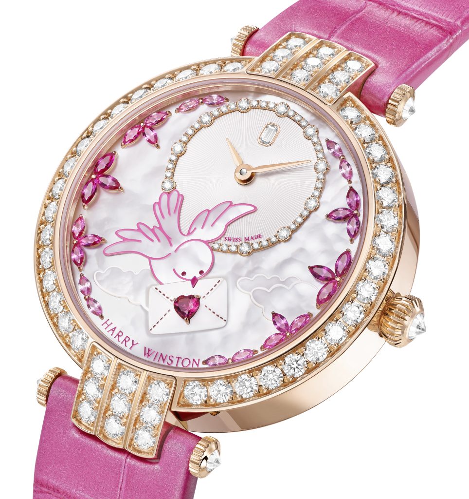 Terminate le caratteristiche tecniche arriviamo al quadrante impreziosito da 40 brillanti e ai suoi numerosi dettagli ispirati al Valentine’s Day. Sulla base d’oro un disegno in madreperla bianca a rilievo è dedicato a un uccellino bordato di rosa che vola sopra il quadrantino di ore e minuti con lancette in oro rosa, circondato da 40 brillanti; nel becco, in zaffiri rosa come gli occhi, porta una lettera laccata e impreziosita da un rubino taglio a cuore. Sul bordo del quadrante il nome Harry Winston è circondato da sei indici in rubini taglio marquise completati da 20 zaffiri rosa taglio marquise; infine a ore 12 un grande diamante taglio smeraldo completa questo segnatempo dove stilisti e maestri gioiellieri hanno fatto a gara per ottenere un risultato favoloso.