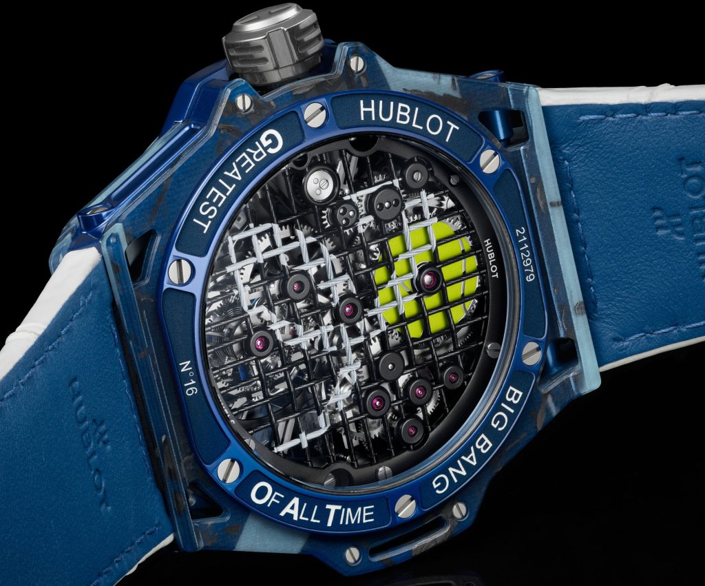 Per ottenere il materiale necessario per realizzare gli orologi sono servite 12 racchette del tennista, oltre a 12 polo blu, 4 arancioni e 2 verdi. Incredibile anche altri dettagli come la scelta dei materiali ispirata dalle corde della racchetta da tennis, ogni “corda” ha uno spessore di soli 0,55 mm e sembra essere fissata al bordo della platina con punti simili a quelli nel bordo interno di una racchetta da tennis. I colori risaltano nella cassa da 44 mm, realizzata con uno speciale composito sviluppato da Hublot utilizzando le polo Lacoste e le racchette Head.