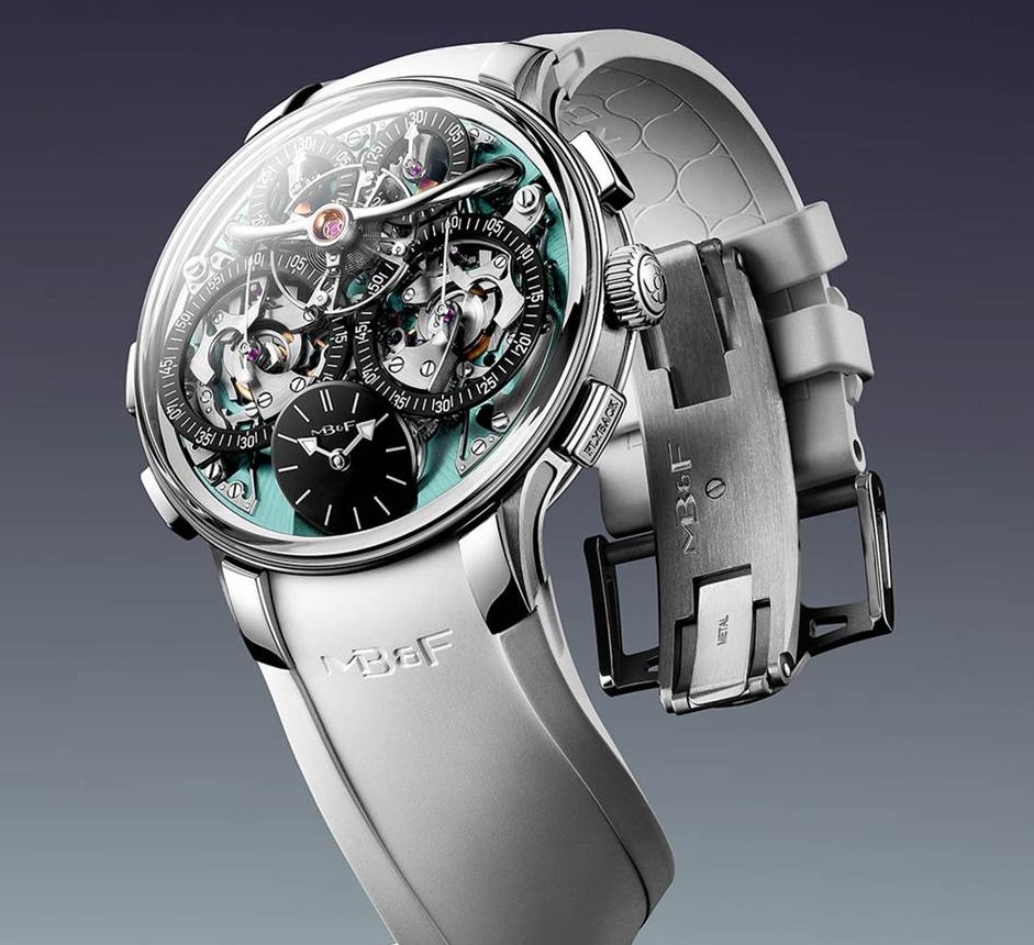 Il Sequential Flyback EVO combina la funzionalità Flyback con il repertorio completo EVO, è progettato per uno stile di vita attivo, ha la cassa, diametro 44,2 mm, in titanio grado 5 w.r. a80 metri, abbinata a un quadrante piatto di acquamarina sul quale il quadrantino del tempo è posizionato a ore sei. L’ammortizzatore FlexRing protegge l’orologio dagli shock improvvisi aumentandone la durata. Il movimento, a carica manuale ha una riserva di carica di 72 ore. il cinturino in caucciù è integrato, la corona è a vite. Inoltre il caratteristico quadrante inclinato MB&F, che non era stato utilizzato nelle edizioni originali EVO ora fa il suo debutto nell’LM Sequential Flyback EVO (forse per chi ci legge per la prima volta, è bene spiegare che LM è l’acronimo di Legacy Machine, un’ampia collezione che il gruppo MB&F ha presentato, se ricordiamo bene, nel 2015).