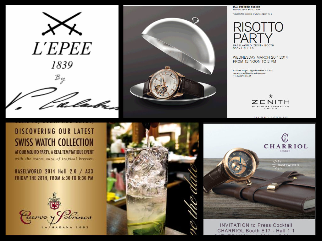 Generalmente iniziano in orari vicini alla chiusura dei padiglioni e si protraggono per un tempo predefinito, ma ce ne sono anche per il breakfast. All’esterno, se c’è bel tempo, ci si ferma nella Messe Platz ad ascoltare Band di jazz che suonano motivi del passato; si beve birra o coca-cola magari vicino a un presidente o a un CEO in un’atmosfera da sagra paesana, ma anche questo è Baselworld.