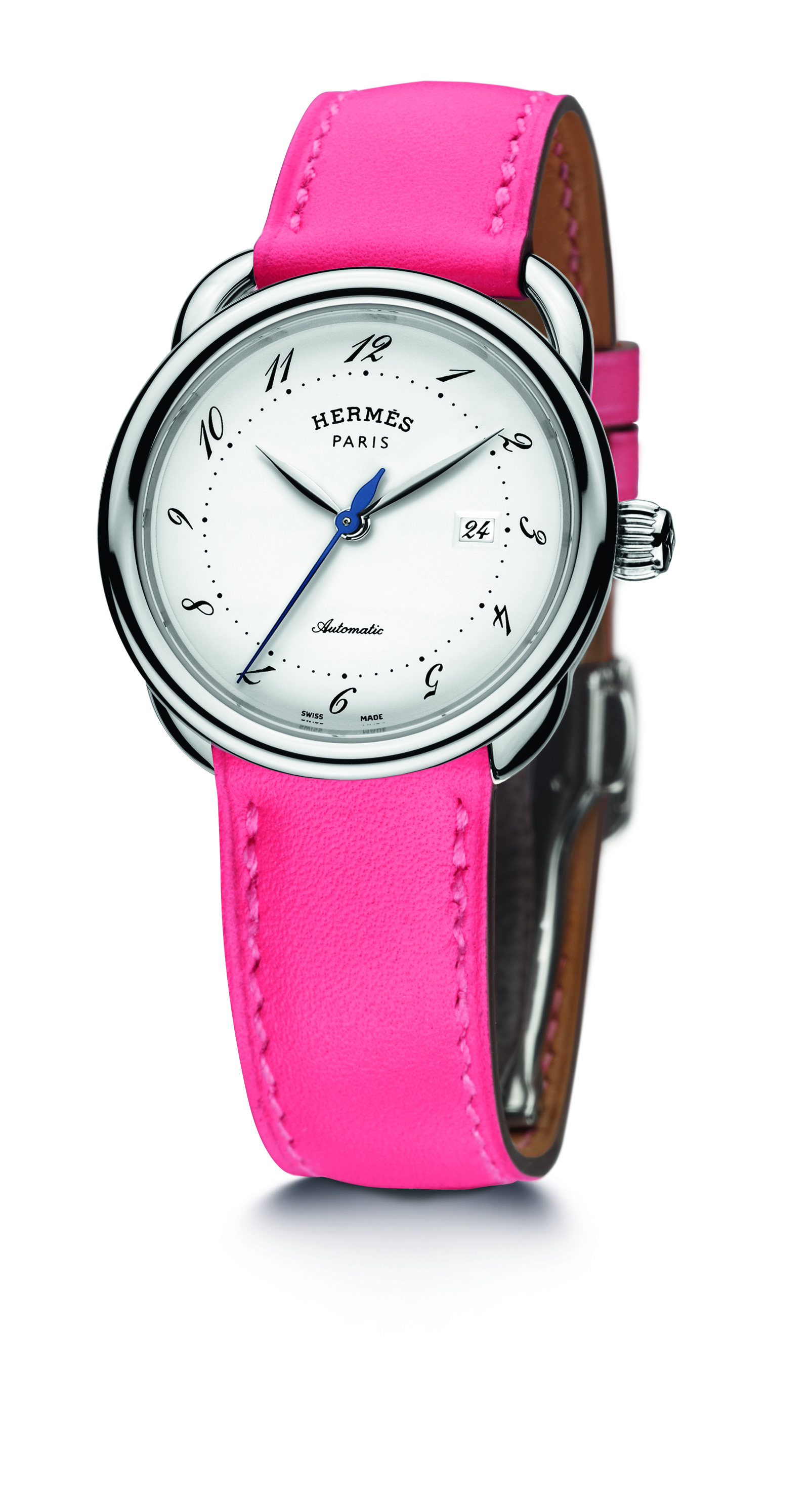 Il Lipstick in questione è una sfumatura di rosa, che si riallaccia ai fiori profumati, impiegata nel cinturino in vitello liscio che vivacizza l’Arceau in acciaio, ø 28 o 32 mm rispettivamente con movimento al quarzo oppure con movimento automatico. La Marca parigina che produce i suoi orologi in Svizzera, pone così in risalto non solo un nuovo segnatempo, ma sembra anche voler tornare alle origini, quando la marroquinerie era la sua produzione principale. Da 176 anni infatti è legata alla produzione degli articoli in pelle e i suoi cinturini cuciti a mano con il celebre punto sellaio, sono un punto di forza; dal 2006 inoltre è stato aperto, all’interno della Montres Hermès, un reparto esclusivamente dedicato ai cinturini.