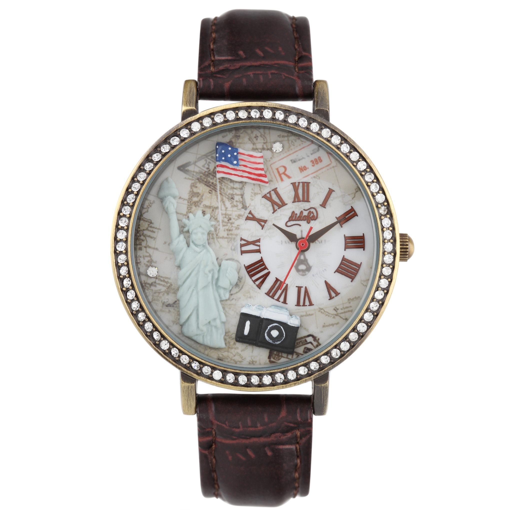 Per quei turisti che non possono volare a New York, nemmeno con biglietti low-cost, ecco un orologio per sentirsi legati alla Grande Mela con statua della libertà, bandiera USA e altro sul quadrante lavorato a 3D; cristalli sulla lunetta e movimento al quarzo.